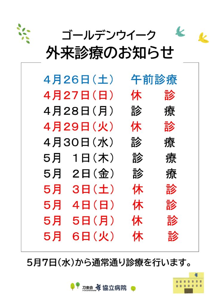 ゴールデンウィーク外来診療のお知らせ 投稿日 2025年4月22日 著者 toukeikai カテゴリー 協立病院のお知らせ ゴールデンウィーク時の外来診療について、日曜・祝祭日以外は通常通り診療をおこなっております。祝日が続きますので必要なお薬などがございましたらお早めの受診をお願いいたします。