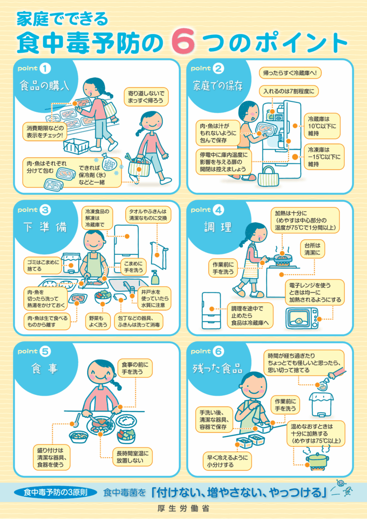 家庭で食中毒を予防するためにできる、具体的な6つのポイントを確認しましょう。