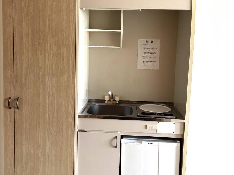 約9畳の居室には、水洗トイレ・ミニキッチン・冷蔵庫・洗面所・収納スペース・パネルヒーターが完備。(エアコンは各自設置)